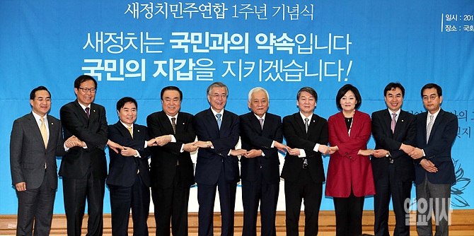 26일, 서울 여의도 국회 의원회관에서 열린 새정치민주연합 1주년 기념식에서 문재인 대표 및 문희상 전 비상대책위원장, 김한길-안철수 전 공동대표, 박영선 전 비대위원장 등 핵심인사들이 손을 맞잡고 있다.
