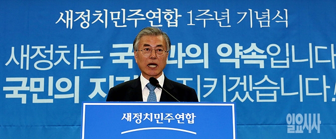 26일, 서울 여의도 국회 의원회관에서 열린 새정치민주연합 1주년 기념식에서 문재인 대표가 축사를 하고 있다.
