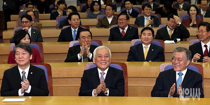 26일, 서울 여의도 국회 의원회관에서 열린 새정치민주연합 1주년 기념식 도중 문재인 대표(사진 오른쪽), 김한길(사진 가운데)-안철수 전 공동대표(사진 왼쪽), 문희상(뒷줄 왼쪽서 두 번째)-박영선(뒷줄 왼쪽) 전 비상대책위원장 등이 박수를 치고 있다.