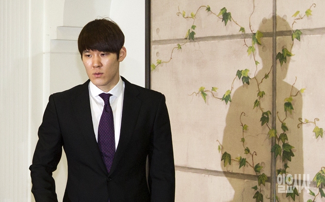 수영선수 박태환이 약물징계 관련 입장을 발표하기 위해 27일 오후 서울 송파구 잠실관광호텔에 마련된 기자회견장에 입장하고 있다.