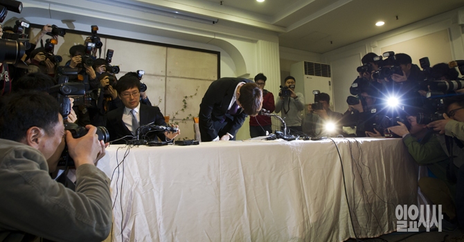 수영선수 박태환이 27일 오후 서울 송파구 잠실관광호텔에서 기자회견을 열고 약물징계 관련 입장을 발표를 마친 뒤 인사하고 있다.
