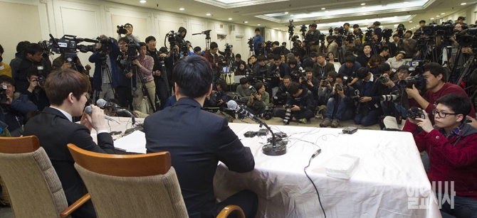 수영선수 박태환이 27일 오후 서울 송파구 잠실관광호텔에서 기자회견을 열고 약물징계 관련 입장을 발표하고 있다.