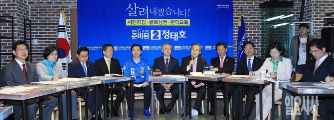 새정치민주연합 문재인 대표, 우윤근 원내대표, 4·29재보궐선거 서울 관악을에 출마한 정태호 예비후보 등이 30일 오전 서울 관악구 난곡로 난향꿈둥지에서 열린 현장 최고위원회의에 참석하고 있다.