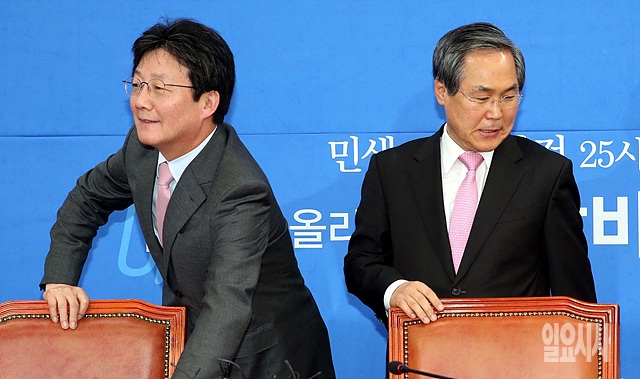 30일, 서울 여의도 국회 여야 주례회동에서 새누리당 유승민·새정치민주연합 우윤근 원내대표가 잠시 미소를 짓고 있다.