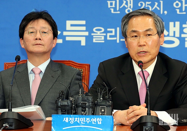 30일, 서울 여의도 국회에서 열린 여야 주례회동에서 새정치민주연합 우윤근 원내대표가 발언하고 있다.