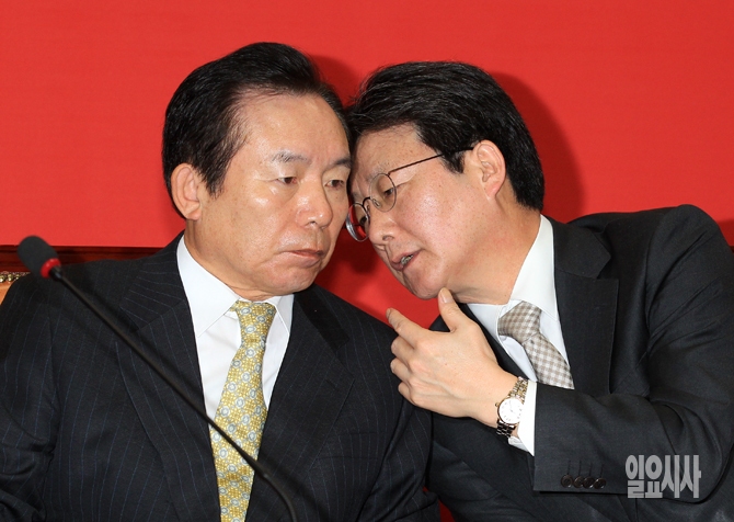 새누리당 유승민 원내대표(오른쪽)와 이인제 최고위원이 1일 오전 서울 여의도 국회에서 열린 당 최고중진연석회의에 참석해 대화를 하고 있다.