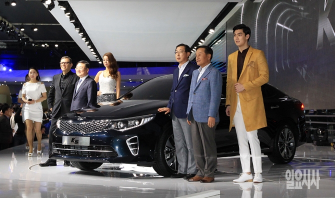 2일 오전 경기도 일산 킨텍스에서 열린 '2015 서울모터쇼 프레스데이'에서 기아자동차의 신형 'K5'를 이형근 부회장등이 소개하고 있다. '2015 서울모터쇼는 2일 프레스데이를 시작으로 오는 12일까지 계속된다.