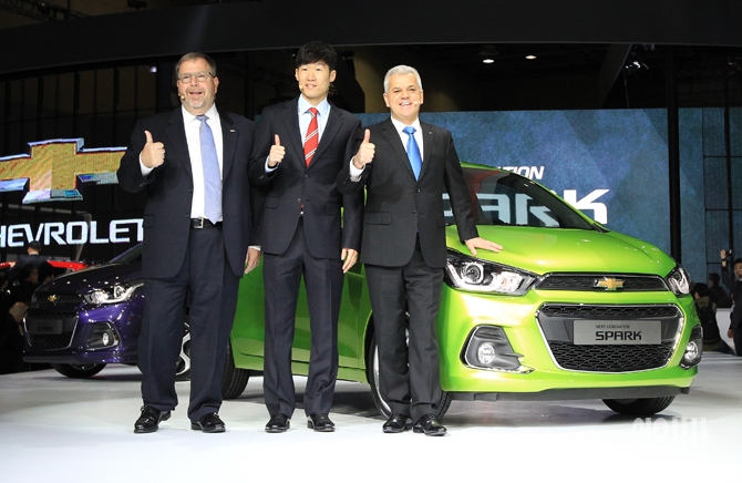 2일 오전 경기도 일산 킨텍스에서 열린 '2015 서울모터쇼 프레스데이'에서 박지성과 세르지오 호샤 한국GM 사장 겸 CEO 등이 차세대 쉐보레 '스파크'를 소개하고 있다. '2015 서울모터쇼'는 2일 프레스데이를 시작으로 오는 12일까지 계속된다.