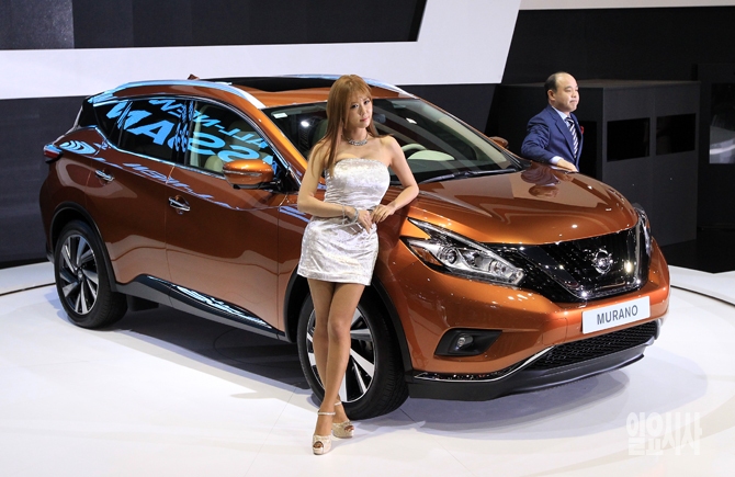 한국닛산이 2일 오전 경기도 일산 킨텍스에서 열린 '2015 서울모터쇼' 언론공개 행사에서  프리미엄 스포츠유틸리티차량(SUV) '올 뉴 무라노(The All New Murano)'를 아시아 최초로 공개하고 있다.