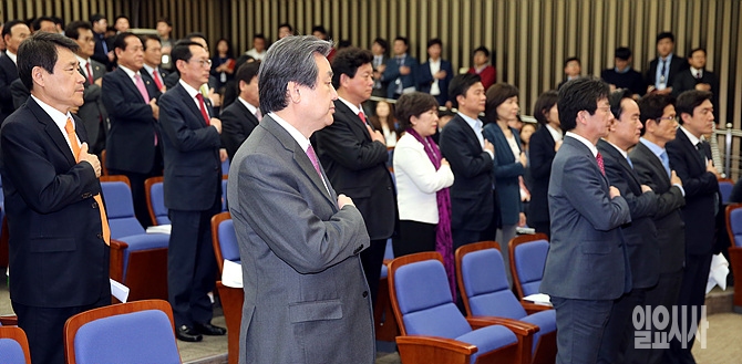 2일, 서울 여의도 국회에서 열린 새누리당 정책 의원총회에서 김무성 대표 등 참석자들이 국기에 대한 경례를 하고 있다.