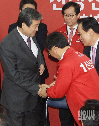 4·29 재보선 성남중원에 출마하는 신상진 후보의 선거사무소 개소식이 열린 3일 오후 경기도 성남시 중원구 중앙동 신 후보의 선거사무소에서 김무성 대표와 신 후보가 악수를 나누고 있다.