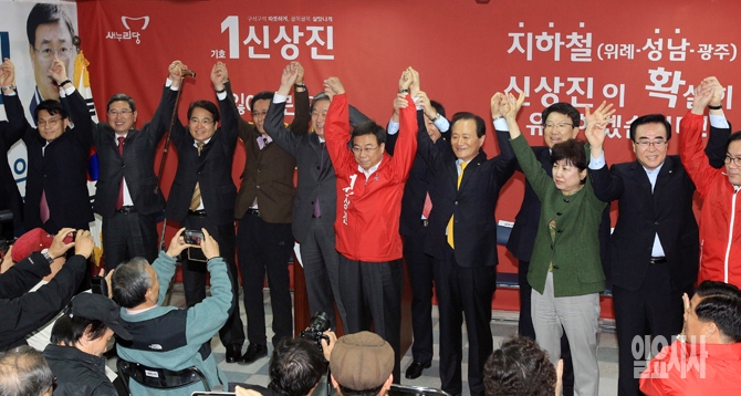 4·29 재보선 성남중원에 출마하는 신상진 후보의 선거사무소 개소식이 열린 3일 오후 경기도 성남시 중원구 중앙동 신 후보의 선거사무소에서 김무성 대표와 신 후보 등이 손을 잡고 지지자들에게 인사하고 있다.