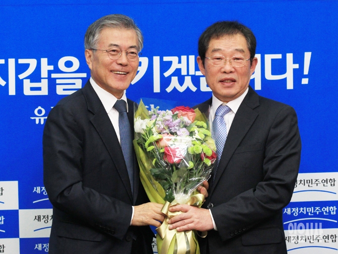 문재인 새정치민주연합 대표가 6일 오전 서울 여의도 국회에서 열린 최고위원회의에 앞서 전국노동위원장에 당선된 이용득 최고위원에게 꽃다발을 건네며 축하하고 있다.