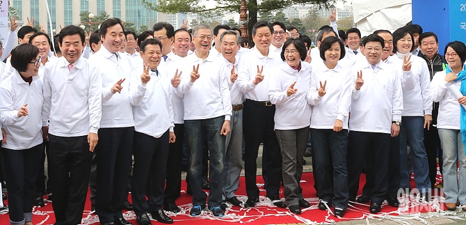 6일, 서울 여의도 국회에서 '새정치 2015 다함께 정책엑스포 테잎 커팅식'이 열린 가운데, 문재인 대표 , 우윤근 원내대표 등 참석자들이 환하게 웃음 짓고 있다.
