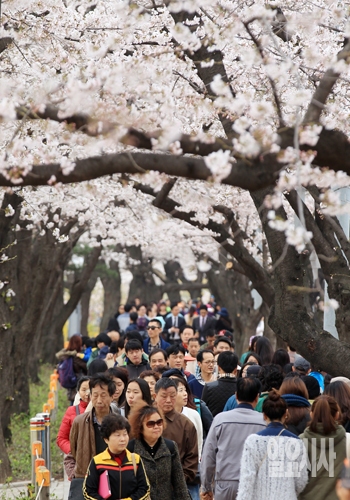 '여의도 벚꽃축제'를 나흘 앞둔 6일 오전 서울 여의도 윤중로에서 외국인 관광객과 시민들이 벚꽃놀이를 즐기고 있다.