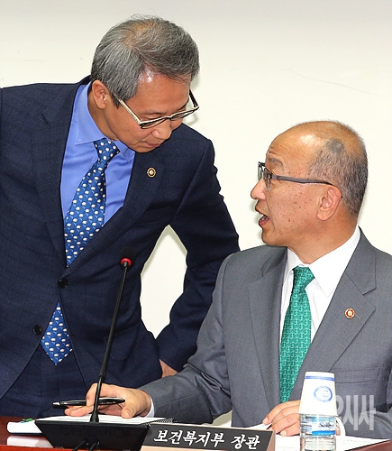 6일, 서울 여의도 국회 공무원연금개혁 특별위원회 전체회의에서 문형표 보건복지부장관과 이근면 인사혁신처장이 이야기를 나누고 있다.
