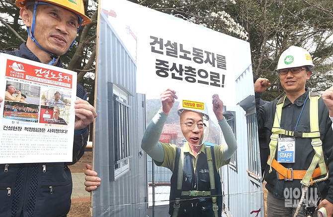 6일, 새정치민주연합 문재인 대표가 국회서 열린 '2015 다함께 정책엑스포' 참석 도중 '건설노동자를 중산층으로' 라는 간판그림을 들고 있다.