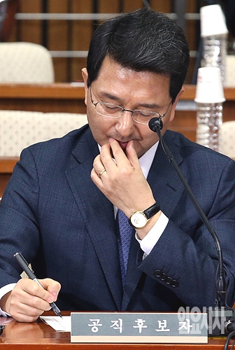 7일, 서울 여의도 국회서 열린 박상옥 대법관 후보자에 대한 인사청문회 도중 박 후보자에게 질의를 받고 잠시 곤란한 표정을 짓고 있다.
