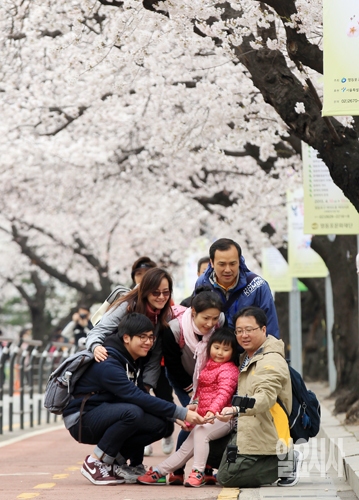 벚꽃축제를 사흘 앞둔 7일 오전 서울 여의도 여의서로에서 중국인 관광객들이 벚꽃놀이를 즐기고 있다.