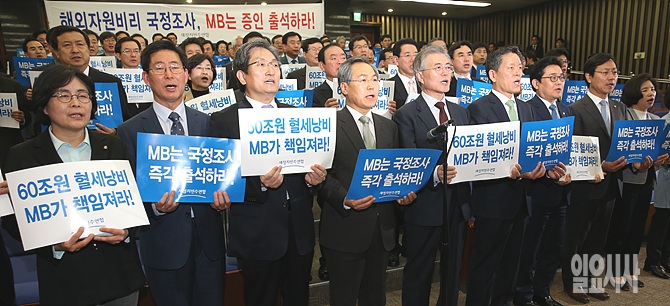 7일, 서울 여의도 국회서 새정치민주연합 문재인 대표, 우윤근 원내대표 등이 'MB는 국정조사 즉각 출석하라', '60조원 혈세낭비, MB가 책임져라' 등의 피켓을 들고 국조 출석을 주장하고 있다.