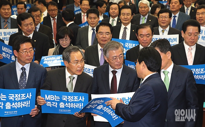 7일, 서울 여의도 국회서 새정치민주연합 문재인 대표, 우윤근 원내대표 등이 MB 국조 출석 규탄대회 직후, 전병헌 최고위원과 잠시 이야기를 나누고 있다.