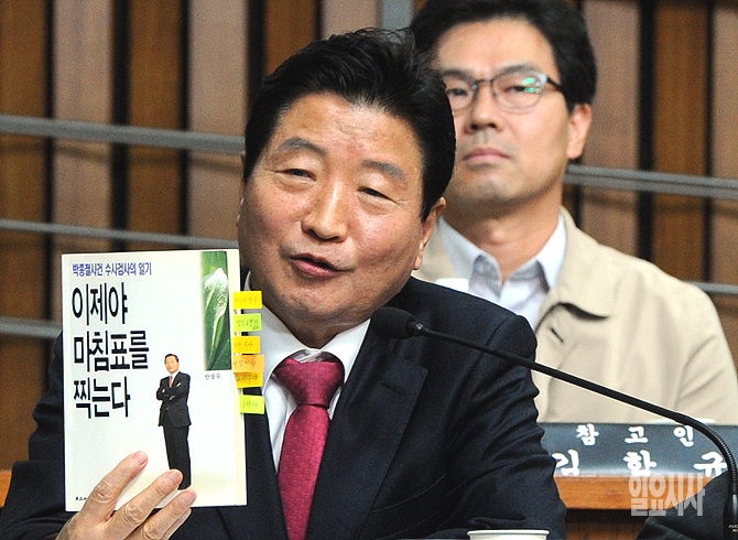 7일, 안상수 창원시장이 서울 여의도 국회 박상옥 대법관 후보자 인사청문회에 출석해 '박종철 고문치사사건'과 관련해 자신이 저서 '이제야 마침표를 찍을 수 있다'를 들고 증언을 하고 있다. 안 시장은 당시 사건을 맡았던 담당검사였다.
