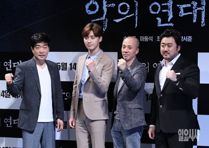 13일 오전 서울 강남구 CGV 압구정에서 열린 영화 <악의 연대기>(감독 백운학) 제작발표회에서 출연진들이 포즈를 취하고 있다. 왼쪽부터 배우 손현주, 박서준, 백운학 감독, 배우 마동석.