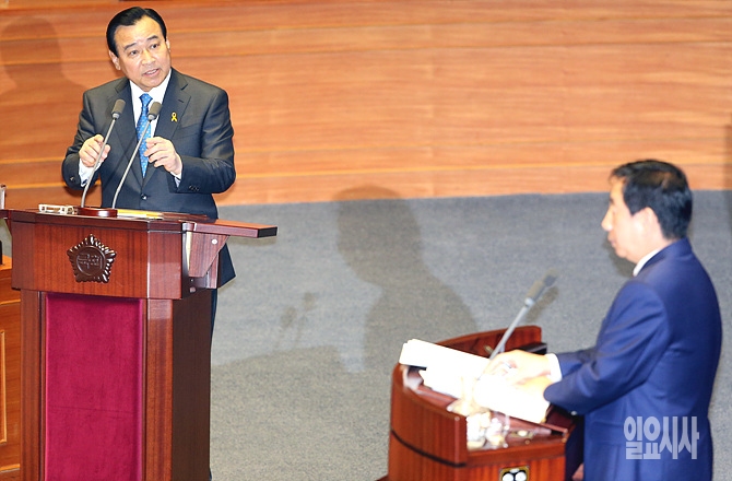 13일, 서울 여의도 국회 본회의장서 열린 국회 대정부질문 첫째날, 이완구 국무총리가 새누리당 김성태 의원 질의에 답변하고 있다.