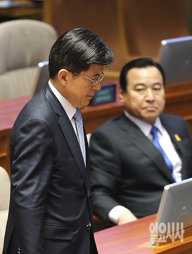 13일, 서울 여의도 국회 본회의장서 열린 국회 대정부질문 첫째날, 황교안 법무부장관이 의원들의 질의에 답변하기 위해 단상으로 나서고 있는 가운데, 이완구 국무총리가 의미심장한 표정을 짓고 있다.