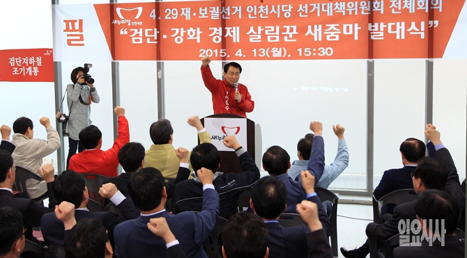 새누리당 인천 서구·강화을에 나가는 새누리당 안상수 후보가 13일 오후 안 후보의 선거사무소에서 열린 '인천시당 선거대책위원회 검단·강화 경제 살림꾼 새줌마 발대식'에서 필승을 다짐하고 있다.