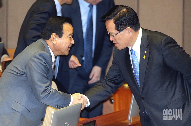 14일, 서울 여의도 국회 본회의장에서 열린 대정부질문 둘째 날, 외교·안보분야 질의 직전, 정의화 국회의장과 이완구 국무총리가 악수를 나누고 있다.