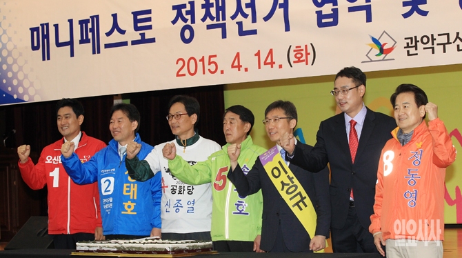 4·29재보궐선거 서울 관악을 후보자들이 14일 오전 서울 관악구청에서 열린 '매니페스토 정책선거 협약 및 공명선거 다짐 대회'에서 기념촬영하고 있다. 왼쪽부터 새누리당 오신환 후보, 새정치민주연합 정태호 후보, 공화당 신종열 후보, 무소속 송광호 후보, 무소속 이상규 후보, 무소속 변희재 후보, 무소속 정동영 후보.