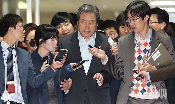 14일, 서울 여의도 국회서 새누리당 비공개 의원총회 직후 김무성 대표가 취재진의 질문세례를 받고 있다.