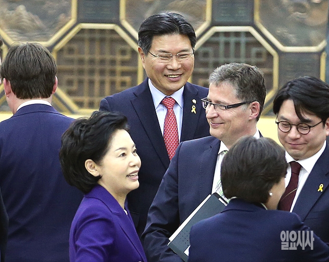 14일, 서울 여의도 국회 로텐더홀에서 새누리당 홍문종 의원이 독일 연방 하원들과 인사를 나누며 웃음 짓고 있다. 홍 의원은 최근 이른바 '성완종 리스트'에 오른 인물로 지난 2012년 대선에서 불법 정치자금을 받은 것으로 알려져 있다.