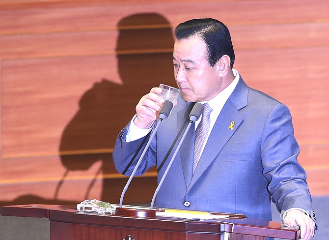 14일, 서울 여의도 국회 본회의장서 열린 외교·안보·통일 분야 대정부질문 도중 이완구 국무총리가 복잡한 심경의 표정을 지으며 물을 들이키고 있다.