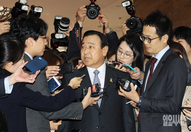 고 성완종 전 경남기업 회장으로부터 선거자금 수수 의혹을 받고 있는 이완구 국무총리가 15일 오전 국회에서 열리는 대정부 질문에 참석하기에 앞서 취재진의 질문에 답변하고 있다.