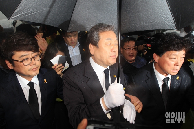 세월호 참사 1주기를 맞은 16일 오후 안산 단원구 세월호 희생자 정부 합동분향소를 찾은 새누리당 김무성 대표가 유가족들의 항의에 발길을 돌리고 있다.