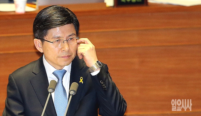 16일, 서울 여의도 국회 본회의장서 열린 사회·교육·문화분야 국회 대정부질문에서 황교안 법무부장관이 의원들의 질의에 귀 기울이고 있다.