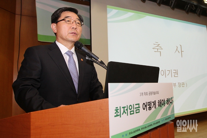 이기권 고용노동부 장관이 17일 오후 서울 중구 명동 은행회관 컨벤션홀에서 열린 최저임금 관련 토론회에 참석해 축사하고 있다.