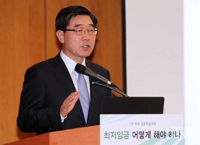 이기권 고용노동부 장관이 17일 오후 서울 중구 명동 은행회관 컨벤션홀에서 열린 최저임금 관련 토론회에 참석해 축사하고 있다.