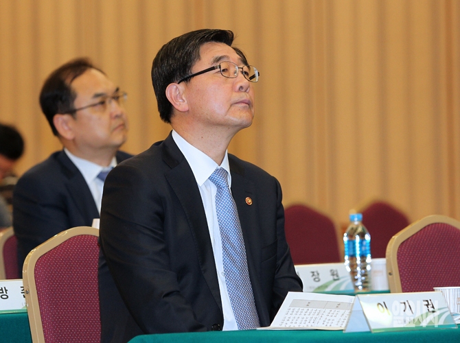 이기권 고용노동부 장관이 17일 오후 서울 중구 명동 은행회관 컨벤션홀에서 열린 최저임금 관련 토론회에 참석하고 있다.