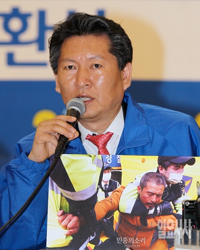 새정치민주연합 정청래 최고위원이 20일 오전 경기도 성남 중원구 성남산업단지관리공단에서 열린 현장 최고위원회의에서 경찰의 세월호 집회 강경대응에 대해 비판하고 있다.