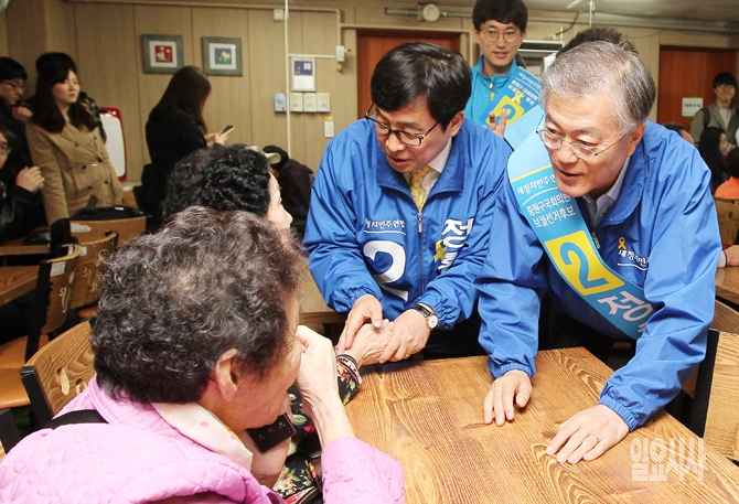 새정치민주연합 문재인 대표가 20일 오전 경기도 성남 중원구 성남종합사회복지관에서 4·29 중원구 국회의원 재보궐선거에 출마하는 정환석 후보와 함께 어르신들에게 지지를 호소하고 있다.