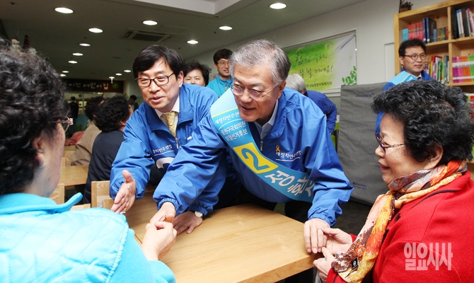 새정치민주연합 문재인 대표가 20일 오전 경기도 성남 중원구 성남종합사회복지관에서 4·29 중원구 국회의원 재보궐선거에 출마하는 정환석 후보와 함께 어르신들에게 지지를 호소하고 있다.