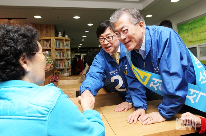 새정치민주연합 문재인 대표가 20일 오전 경기도 성남 중원구 성남종합사회복지관에서 4·29 중원구 국회의원 재보궐선거에 출마하는 정환석 후보와 함께 어르신들에게 지지를 호소하고 있다.
