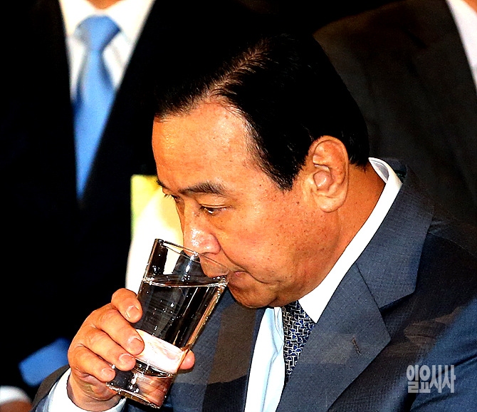 20일, 서울 여의도 63빌딩서 열린 '장애인의 날' 기념행사에 참석한 이완구 국무총리가 목이 타는 듯 잠시 물을 들이키고 있다.