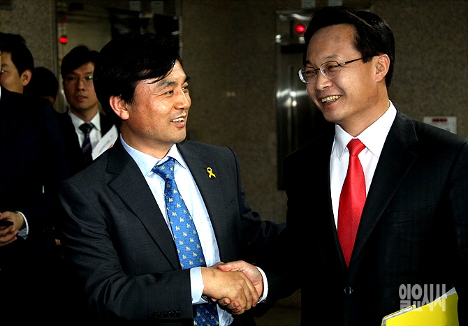 20일, 서울 여의도 국회에서 여야 주례회동 직후, 조해진-안규백 여야 원내수석부대표가 악수를 나누고 있다.