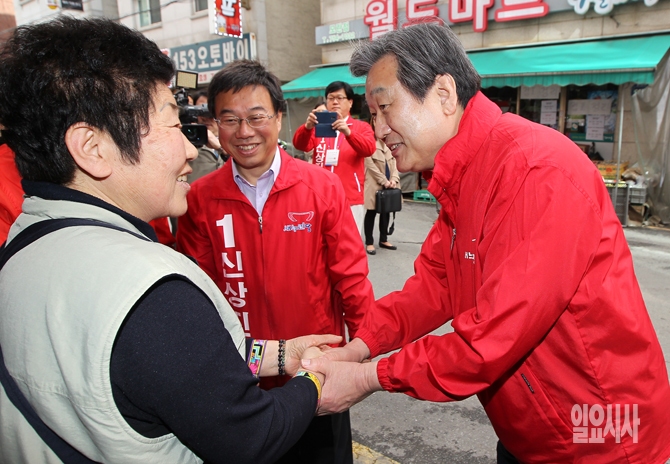 새누리당 김무성 대표가 20일 오후 경기도 성남 중원구 성남동 복지촌길에서 4·29 중원구 국회의원 재보궐선거에 출마하는 신상진 후보와 함께 어르신들에게 지지를 호소하고 있다.