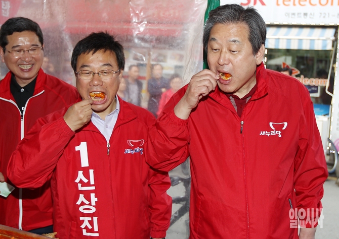 새누리당 김무성 대표가 20일 오후 경기도 성남 중원구 성남동 복지촌길의 한 분식점에서 4·29 중원구 국회의원 재보궐선거에 출마하는 신상진 후보와 함께 거리유세 도중 떡볶이를 먹고 있다.
