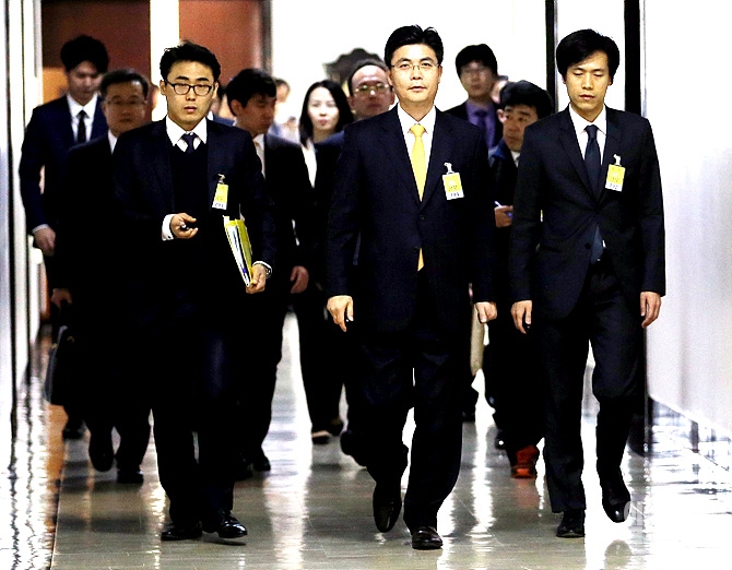 20일, '서울예술종합학교 비리' 의혹을 받고 있는 새정치민주연합 신학용 의원에 대한 현장검증을 위해 법원 관계자들이 서울 여의도 국회 교육문화체육관광위원회 위원장실을 향하고 있다.